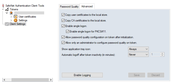 Next, we select Client Settings. Under the Advanced tab, I like to highlight Enable Single Logon and PKCS#11.