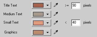 We have 3 types of text: Tilte, Medium and Small. They differ in a pixel size that is set in the edit box beside. For example a title text is defined as text of size 90 and bigger. It also means that if you resize text on a menu with a scheme, the color will also change if you cross these boundaries.